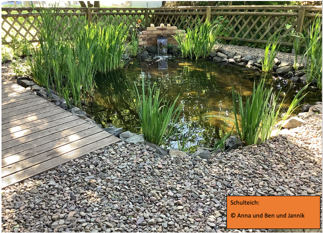 Der Schulteich war zuvor über zehn Jahre ein beliebter Lern- und Aufenthaltsort, jedoch in die Jahre gekommen: Ohne funktionierende Pumpe wurde das Wasser trüb, die Wasserpest verdrängte andere Pflanzen und die Fische wurden weniger. Mit einem modernen Filtersystem und einer energieeffizienten Pumpe konnte der Lebensraum nachhaltig revitalisiert werden.