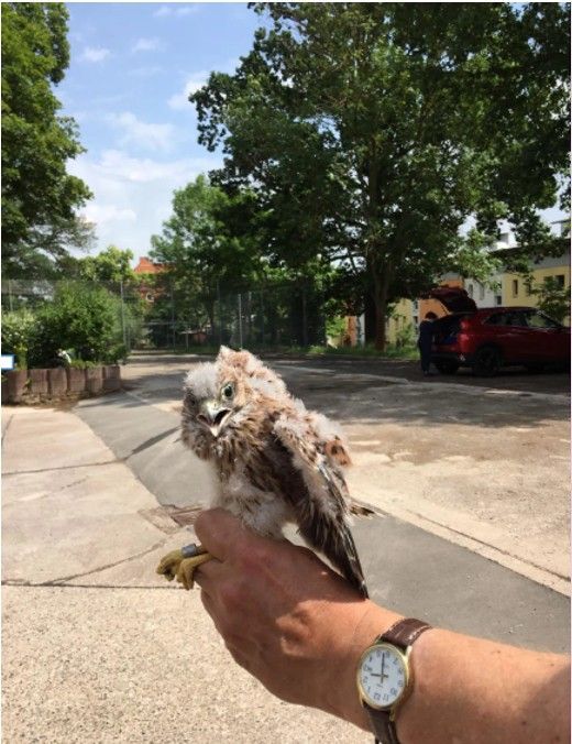 Bereits seit 2020 beheimatet unser Förderzentrum auf dem alten Schornstein des Heizhauses Turmfalken. Das zweite Bild zeigt mit dem Pfeil auf die Stelle, wo sich der Turmfalkenhorst befindet.